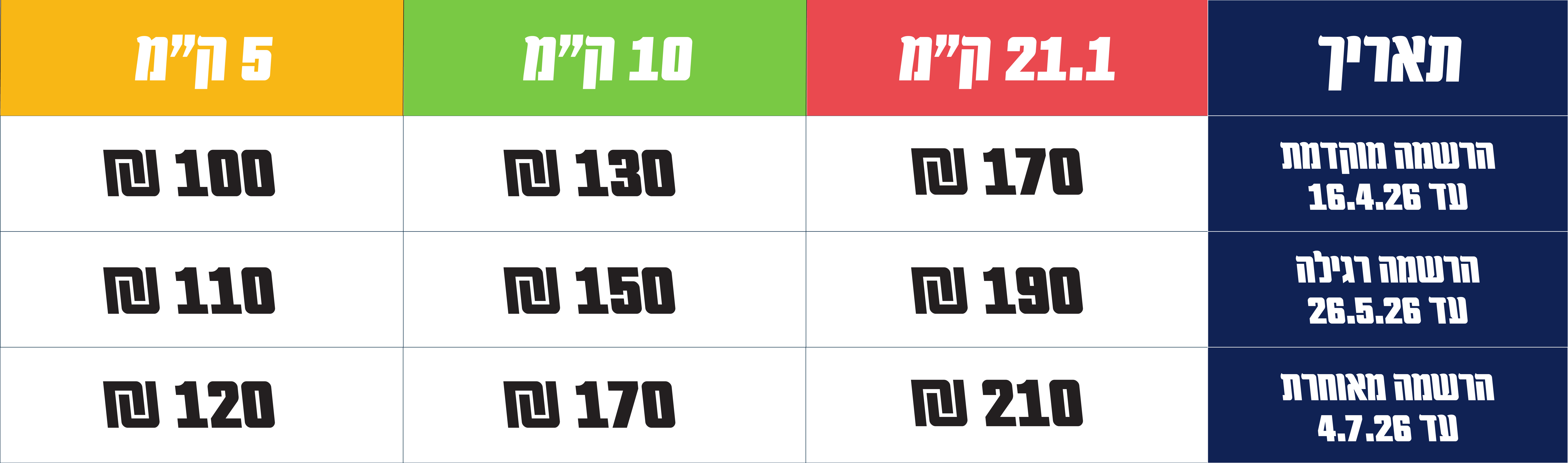 * 21.1 ק"מ – 16 ומעלה (למשתתפים עד גיל 18 מותנה באישור הורה בעת ביצוע הליך הרישום).